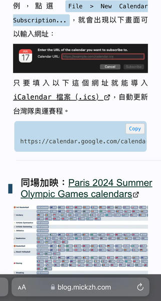 只要填入以下這個網址就能導入 iCalendar 檔案(.ics),自動更新台灣隊奧運賽程。